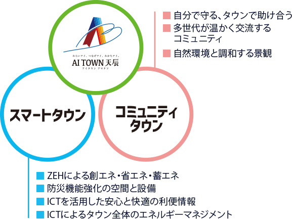 クリーンな太陽光のエネルギーを取り入れ、それを賢く使う最新の設備が一体になった住まいがAITOWN天辰のスタンダード。そこに交流を深めると同時に、災害時を想定した住人を守るための空間や設備を計画しました。みんなで助け合うやさしい思いやりが生まれるコミュニティの起点でもあります。鹿児島県では初めてとなるICTを活用した快適な暮らしを支えるまちのポータルサイト整備まで、ひとに、地球環境に思いをめぐらした先進の発想が注がれています。スマートな暮らし提案と、あたたかなタウン・コミュニティが結びついたこのまちへ、ようこそ。