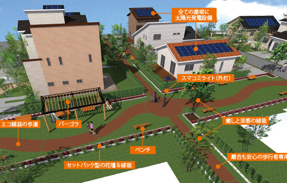 自然エネルギーを自給し、分け合うことができて、さらにすべての人が安心して暮らせる防災配慮型タウンです!