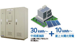 集合住宅棟には、太陽光発電や業務用蓄電システムを配備し、共用設備や1階施設 へ電力供給。特に業務用蓄電池は非常時を中心に利用していきます。