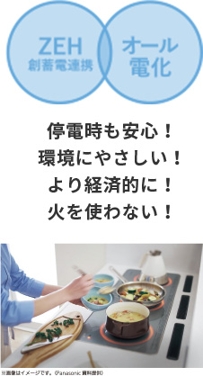 太陽光発電による創エネと蓄電池による蓄エネを組み合わせれば、停電時でも生活に必要な電気機器を稼働できます。だから、災害時にも心強いのがZEHです。防災への視点を大切にするAlTOWN天辰のまちに相応しいメリットです。