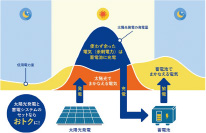 たっぷり発電した太陽からの自然エネルギーをしっかり貯めて、効率的に電力を利用できるのが蓄電システム。普段はお得な夜間電力を使って電気を貯めて、電気代が割高な日中は蓄電池の電気を使用。さらに停電の時には、貯めておいた蓄電池の電気を使うことができます。