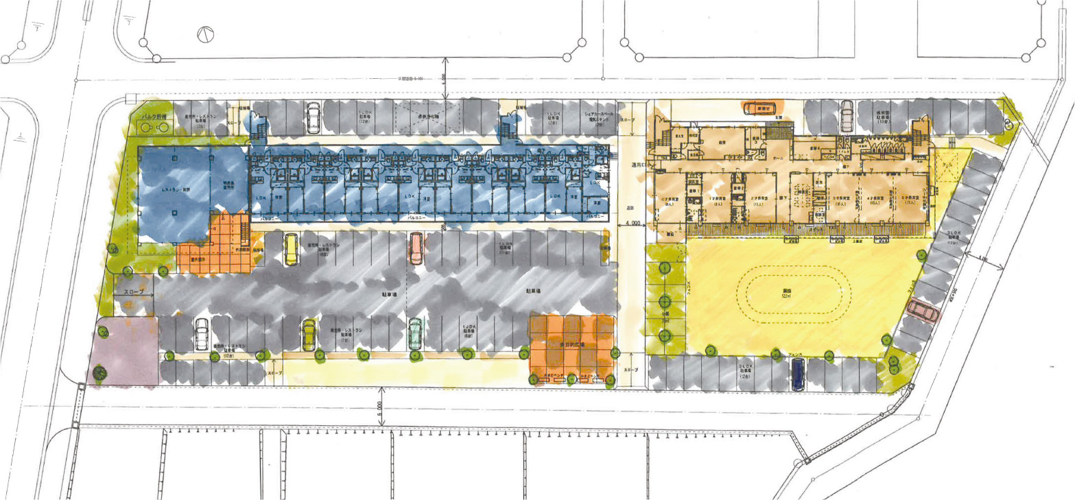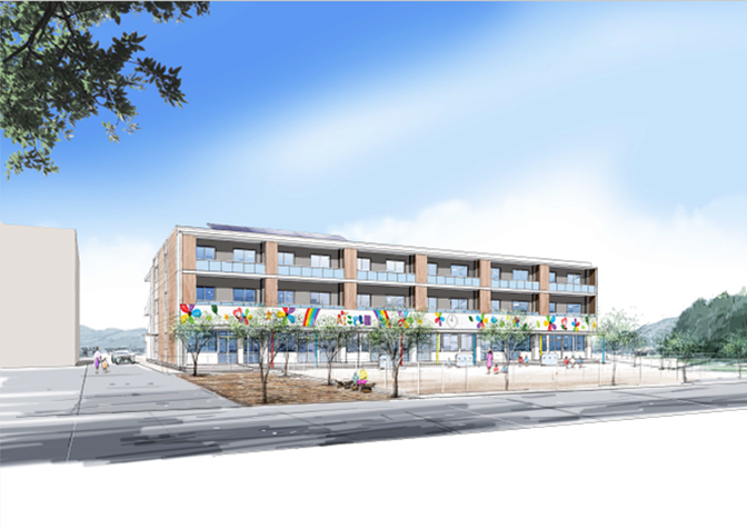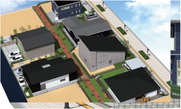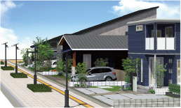 戸建住宅だけで構成されるまちは、ひとの流れが固定されがちです。Al TOWN天辰では、地域との確かなつながりと、多世代の交流が生まれ、ひとを呼び込むための賑わい要素を北側に計画しました。それが2棟からなる鉄筋コンクリート造3階建の集合住宅棟です。予定では、認定こども園やレストランなどのテナント、集会所。単身世帯(1LDK)・家族世帯向け(3LDK)の賃貸住宅を設計に盛り込んでいます。施設利用者や入居者のための駐車場もたっぷりと用意。こども園専用の庭、多目的広場まで、屋外の敷地を元気な声と憩いの時間のために利用しています。
