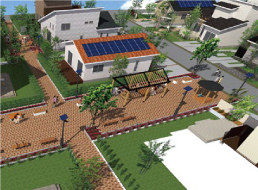 この「モデルハウス・エリア」は、いわば東側60世帯強の“居住エリア、に整備される「活力あるコミュニティ」、「防災・防犯」のコンセプトがギュッと圧縮された設計になります。季節感と目に潤いを与える自然との調和を図った植栽、住人のコミュニケーションを深めるポケット・パークには、災害時にかまどに転用できるベンチも設置。また、このエリアを広角に監視する防犯力メラや街灯も並び、犯罪の抑止効果を高めます。また、CTによるポータルサイトの多彩なコンテンツや家電操作の連携も行えます。